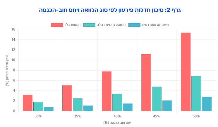 תיאור הגרף: הגרף משווה את הסיכון לאי-פירעון בין סוגי הלוואות שונים לאורך ספקטרום יחסי חוב-הכנסה. עבור יחס חוב-הכנסה של 45% (הממוצע בהלוואות בלון), סיכון אי-פירעון בהלוואת בלון עומד על 11.2% לעומת 4.8% בהלוואה צרכנית רגילה – פער של 133%. ככל שיחס החוב-הכנסה עולה, הפער מתרחב: ביחס של 50%, הסיכון בהלוואת בלון הוא 15.4% לעומת 6.9% בהלוואה רגילה (פער של 123%).