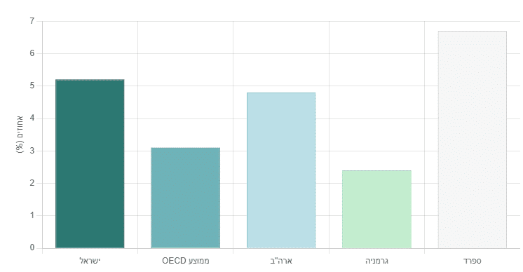 • שיעור חדלות פירעון גבוה: ישראל עם 5.2% גבוהה משמעותית מממוצע ה-OECD (3.1%). פער של 2.1 נקודות אחוז במדד זה נחשב משמעותי בשוקי אשראו מפותחים.