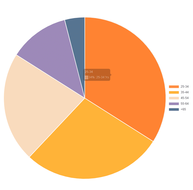 תיאור הגרף: גרף עוגה המציג את חלוקת הלווים בהלוואות בלון לפי קבוצות גיל. הפרוסה הגדולה ביותר (34%) שייכת לדור הצעיר (25-34), הפרוסה השנייה בגודלה (28%) לקבוצה 35-44. יחדיו, קבוצות הגיל 25-44 מהוות 62% מכלל הלווים בהלוואות בלון. לעומת זאת, קבוצת הגיל 65+ מהווה רק 4% מהלווים.