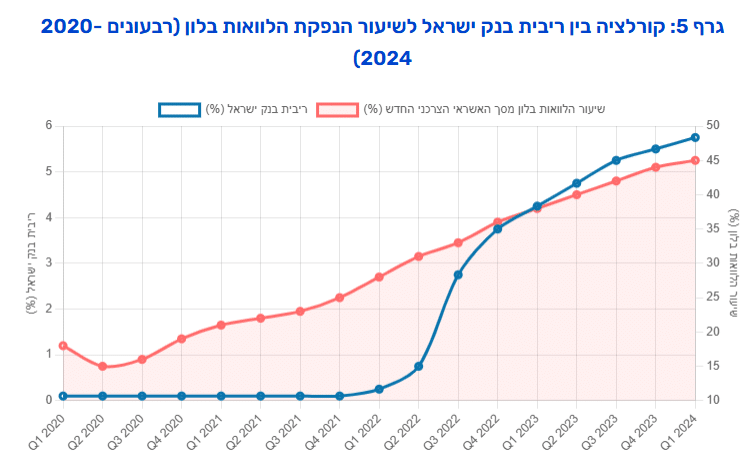 תיאור הגרף: גרף קווי כפול המציג שתי מגמות לאורך 17 רבעונים (Q1 2020 עד Q1 2024). הקו הכחול מראה את עליית ריבית בנק ישראל מ-0.1% בתחילת 2020 ל-5.75% ב-Q1 2024. הקו האדום מראה את עליית שיעור הלוואות הבלון מסך האשראי הצרכני החדש מ-18% ל-45% באותה תקופה. הקווים עולים במקביל, עם האצה ברורה משנת 2022, אז החלה עליית הריבית המשמעותית.