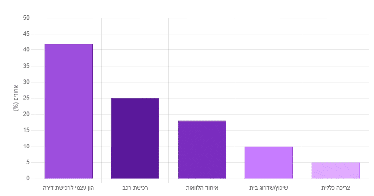 1. הון עצמי לרכישת דירה (42%): רוב מוחלט של הלוואות הבלון נועד לגייס הון עצמי לרכישת דירה. מדובר ב"פירמידת חוב" קלאסית: הלוואה מסוכנת (בלון) נלקחת כדי לעמוד בדרישה של הלוואה גדולה עוד יותר (משכנתא). אם שוק הדיור יתקרר או אם הלווה יאבד את מקור פרנסתו, הוא עלול למצוא עצמו במצב כפול: לא יכול לעמוד בפירעון הבלון וגם בסכנת עיקול הדירה החדשה.