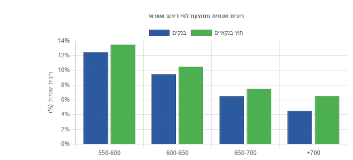 תובנה: הפער הגדול ביותר בריביות (6.2%) מתקיים בדירוג 550-600. ככל שהדירוג נמוך יותר, הבנקים גובים פרמיית סיכון גבוהה יותר.