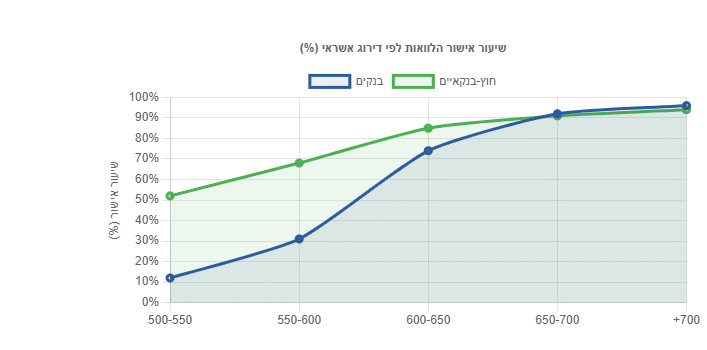 תובנה: הגופים החוץ-בנקאיים מראים עקביות גבוהה יותר באישור הלוואות לבעלי דירוג נמוך, בעוד הבנקים מראים ירידה חדה מתחת ל-600 נקודות.